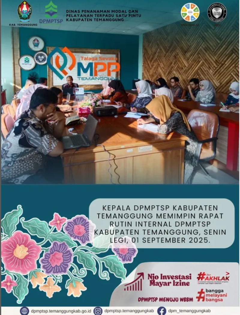 Berita Kategori: Pengumuman Bidang Pemadaman Kebakaran Senin, 01/09/2025 15:01 32 Petugas Damkar Temanggung Lakukan Penyemprotan Material Pasca Demo di Alun-Alun, Dua Warga Jadi Korban Selengkapnya Kategori: Smart Government (Pemerintah Cerdas) Inspektur Pembantu I Senin, 01/09/2025 14:50 43 Rakor Evaluasi Mandiri PUG & PPE bersama DPPPAPPKB Kabupaten Temanggung Selengkapnya Kategori: Smart Government (Pemerintah Cerdas) Inspektur Pembantu II Senin, 01/09/2025 14:48 38 Inspektorat Kabupaten Temanggung – Konsultasi & Penandatanganan Addendum MoU bersama BPKP Jateng Selengkapnya Kategori: Smart Government (Pemerintah Cerdas) Bidang Kesatuan Bangsa Senin, 01/09/2025 13:43 30 Sosialisasi di SMK Sosialisasi di SMK Ganesa kedu Temanggung terkait dengan kondusifitas wilayah kedu Temanggung terkait dengan kondusifitas wilayah Selengkapnya Kategori: Smart Society (Masyarakat Cerdas) Sekretariat Senin, 01/09/2025 11:53 50 Hati-hati dan Bijak Bermedia Sosial, Pesan Kadinkominfo Saat Jadi Pembina Apel di SMK HKTI Selengkapnya Kategori: Smart Government (Pemerintah Cerdas) Bidang Perlindungan dan Jaminan Sosial Senin, 01/09/2025 11:46 40 Dinas Sosial Kabupaten Temanggung bersama Taruna Siaga Bencana (TAGANA) Temanggung melakukan kegiatan penanggulangan bencana kebakaran Selengkapnya Kategori: Smart Government (Pemerintah Cerdas) Seksi Pencegahan dan Kesiapsiagaan Senin, 01/09/2025 10:29 23 Kepala Pelaksana BPBD Temanggung Pimpin Apel Pagi Cipta Kondisi Aman dan Kondusif di SMA Selengkapnya Kategori: Smart Government (Pemerintah Cerdas) Bidang Kearsipan Senin, 01/09/2025 10:13 29 Surat Himbauan Kepala ANRI Nomor : B/KN.02/1649/2025 tanggal 1 September 2025 Perihal Peningkatan Kewaspadaan dan Perlindungan Arsip Selengkapnya Kategori: Smart Government (Pemerintah Cerdas) Sekretariat Senin, 01/09/2025 09:12 26 REKAPITULASI PELAYANAN DOKUMEN ADMINISTRASI KEPENDUDUKAN DAN PENCATATAN SIPIL Selengkapnya Kategori: Lainnya Sekretariat Senin, 01/09/2025 09:10 62 Purna Tugas Pegawai PNS DINKOPDAG Kabupaten Temanggung Selengkapnya Kategori: Smart Society (Masyarakat Cerdas) Sekretariat Senin, 01/09/2025 09:05 28 Kegiatan Upacara dalam rangka sosialisasi Perpustakaan di SMKN Jumo Selengkapnya Kategori: Smart Government (Pemerintah Cerdas) Sekretariat Senin, 01/09/2025 08:44 2 Kegiatan DPMPTSP Selengkapnya FirstPrev8788899091NextLast
