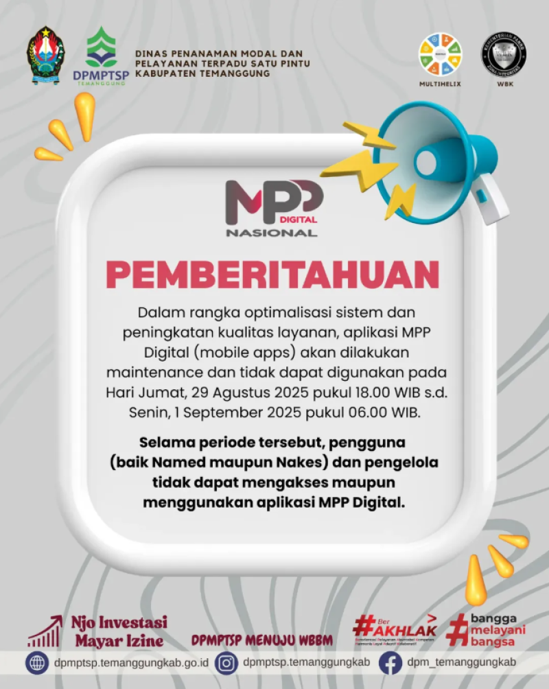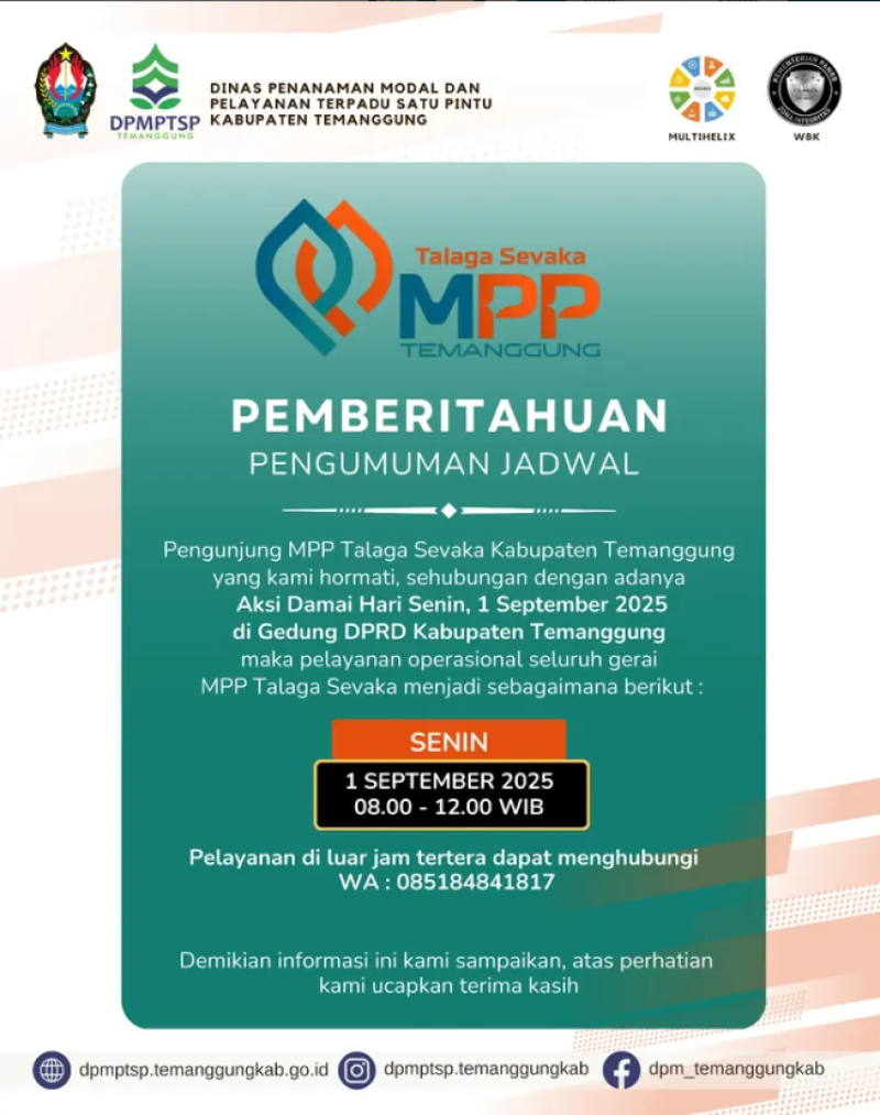 Berita Kategori: Smart Government (Pemerintah Cerdas) Sekretariat Senin, 01/09/2025 08:44 2 Kegiatan DPMPTSP Selengkapnya Kategori: Smart Government (Pemerintah Cerdas) Sekretariat Senin, 01/09/2025 08:43 1 Pengumuman Selengkapnya Kategori: Smart Government (Pemerintah Cerdas) Sekretariat Senin, 01/09/2025 08:42 2 Pengumuman Selengkapnya Kategori: Smart Government (Pemerintah Cerdas) Sekretariat Senin, 01/09/2025 08:12 32 Rapat Membahas Tentang Kegiatan DPUPR Bidang Bina Marga dan Bidang Sumber Daya Air Selengkapnya Kategori: Smart Government (Pemerintah Cerdas) Sekretariat Senin, 01/09/2025 08:11 49 Selamat Purna Tugas Bp. Dul Ghoni Selengkapnya Kategori: Smart Government (Pemerintah Cerdas) SPI Senin, 01/09/2025 07:56 134 Informasi Layanan Poliklinik Selengkapnya Kategori: Smart Government (Pemerintah Cerdas) SPI Senin, 01/09/2025 07:55 131 SELAMAT MEMASUKI PURNA TUGAS Selengkapnya Kategori: Smart Government (Pemerintah Cerdas) SPI Senin, 01/09/2025 07:54 128 Informasi Jadwal Poliklinik Selengkapnya Kategori: Pengumuman Bidang Pemadaman Kebakaran Senin, 01/09/2025 06:54 27 Angka Kejadian Kebakaran di Kabupaten Temanggung per Agustus 2025 Selengkapnya Kategori: Lainnya Seksi Penanganan Darurat dan Logistik Minggu, 31/08/2025 09:31 8 BPBD Temanggung Dukung Peralatan Tangki Air untuk Antisipasi Aksi Damai di Polres Temanggung Selengkapnya Kategori: Smart Government (Pemerintah Cerdas) Sekretariat Minggu, 31/08/2025 07:21 16 SIAGA BENCANA LONGSOR Selengkapnya Kategori: Smart Government (Pemerintah Cerdas) Seksi Pencegahan dan Kesiapsiagaan Sabtu, 30/08/2025 13:23 7 Waspada ancaman hewan peliharaan saat bencana Selengkapnya FirstPrev8889909192NextLast