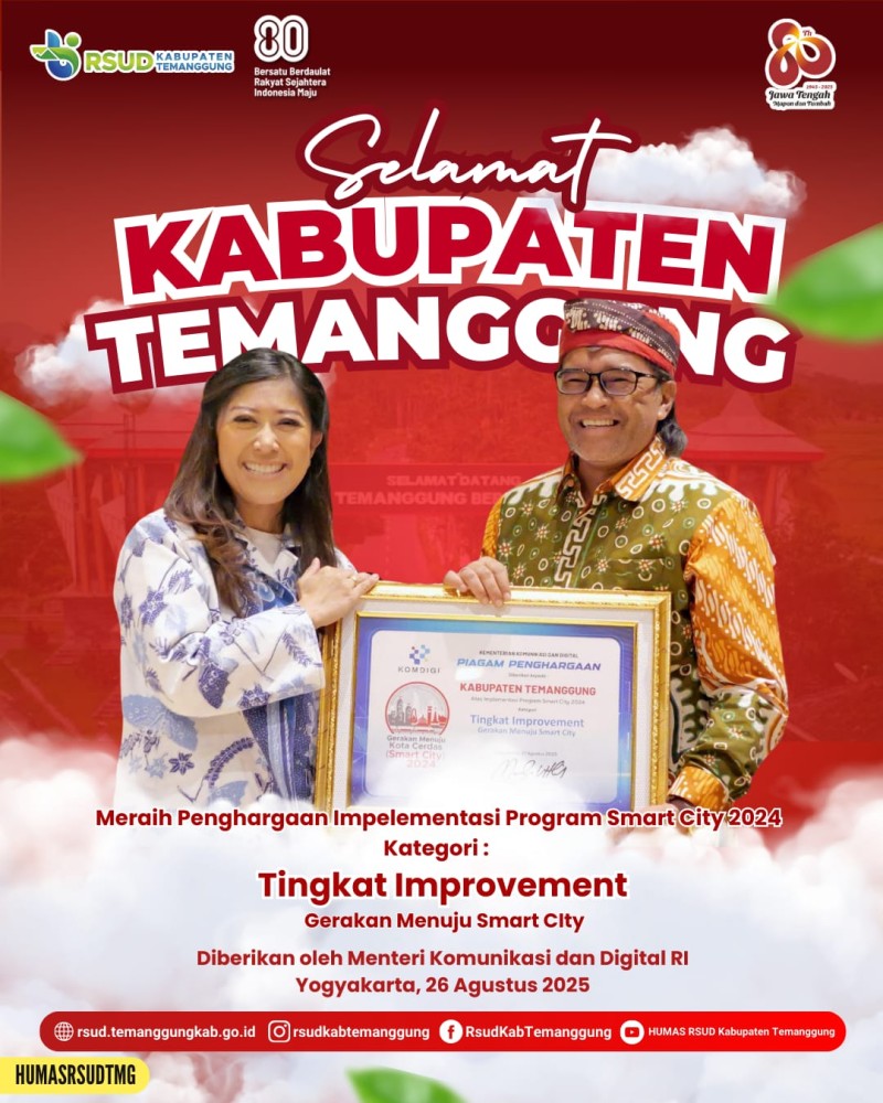 Berita Kategori: Smart Society (Masyarakat Cerdas) Bidang Pemerintahan Desa Kamis, 28/08/2025 10:45 41 Kepala Dinpermades Temanggung Hadiri Pelantikan Perangkat Desa Tegalrejo Jabatan Kepala Dusun Kramat Selengkapnya Kategori: Smart Government (Pemerintah Cerdas) Sekretariat Kamis, 28/08/2025 10:31 19 Pendampingan Pengarusutamaan Gender (PUG) bagi OPD & Kecamatan se-Kabupaten Temanggung Selengkapnya Kategori: Smart Government (Pemerintah Cerdas) Sekretariat Kamis, 28/08/2025 10:00 24 PENDAMPINGAN PUG PERANGKAT DAERAH Selengkapnya Kategori: Smart Government (Pemerintah Cerdas) Bidang Kesehatan Masyarakat Kamis, 28/08/2025 09:46 32 Assessment 25 Keterampilan Dasar Kader di Kelurahan Sidorejo dan Walitelon Selatan Temanggung Selengkapnya Kategori: Smart Government (Pemerintah Cerdas) Bidang Politik dan Organisasi Kemasyarakatan Kamis, 28/08/2025 09:45 43 Pendampingan Pelaksanaan PUG Kabupaten Temanggung tahun 2025 Selengkapnya Kategori: Smart Government (Pemerintah Cerdas) Sekretariat Kamis, 28/08/2025 09:10 17 REKAPITULASI PELAYANAN DOKUMEN ADMINISTRASI KEPENDUDUKAN DAN PENCATATAN SIPIL Selengkapnya Kategori: Smart Environtment (Lingkungan Cerdas) Bidang Pengelolaan Pelayanan dan Pembinaan Keluarga Berencana Kamis, 28/08/2025 09:00 43 Launching Desa Kampung Keluarga Berkualitas se Kecamatan Tembarak Selengkapnya Kategori: Smart Government (Pemerintah Cerdas) Sekretariat Kamis, 28/08/2025 08:36 21 Presentasi Laporan KKN dan Penjaringan Inovasi Mahasiswa UNNES Giat 12 Tahun 2025 Selengkapnya Kategori: Smart Environtment (Lingkungan Cerdas) Sekretariat Kamis, 28/08/2025 08:00 38 Pendampingan Pelaksanaan Pengarusutamaan Gender (PUG) bagi OPD dan Kecamatan se-Kabupaten Temanggung Selengkapnya Kategori: Smart Government (Pemerintah Cerdas) SPI Kamis, 28/08/2025 07:51 116 Dalam rangka menjaga kebersihan dan kenyamanan lingkungan rumah sakit, tim cleaning climbing Etos melaksanakan kegiatan pembersihan kaca Gedung Poliklinik RSUD Kabupaten Temanggung. Selengkapnya Kategori: Smart Government (Pemerintah Cerdas) SPI Kamis, 28/08/2025 07:48 109 SELAMAT DAN SUKSES Atas Penghargaan Implementasi Program Smart City 2024 Kategori Tingkat Improvement Gerakan Menuju Smart City Selengkapnya Kategori: Smart Government (Pemerintah Cerdas) Seksi Pencegahan dan Kesiapsiagaan Rabu, 27/08/2025 21:00 8 SIAGA BENCANA KEKERINGAN Selengkapnya FirstPrev9899100101102NextLast