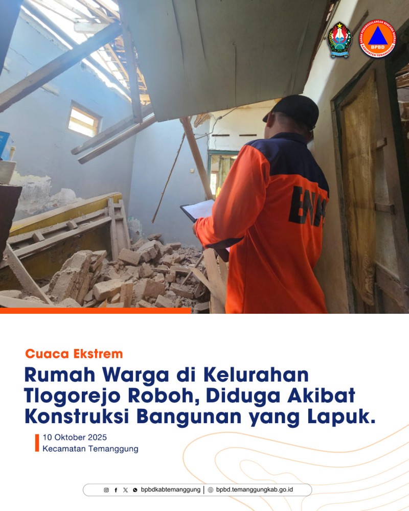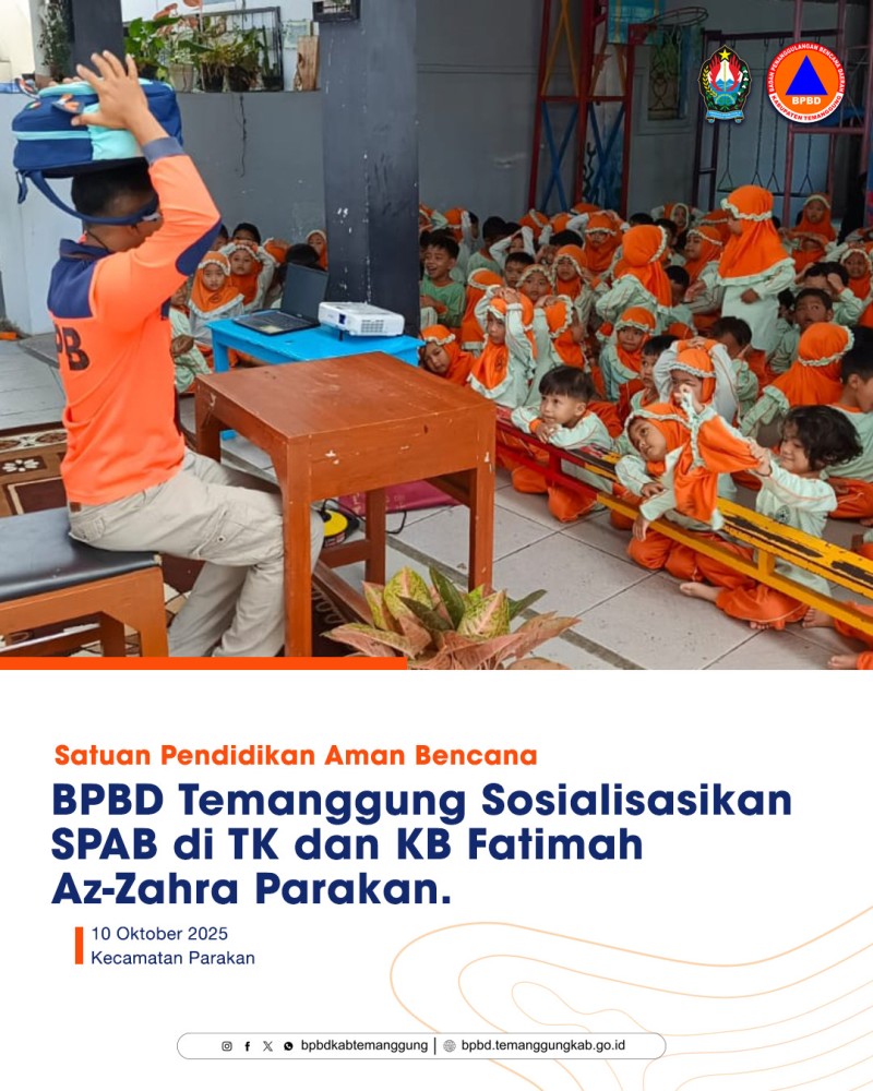 Berita Kategori: Smart Government (Pemerintah Cerdas) Seksi Rehabilitasi dan Rekontruksi Jumat, 10/10/2025 17:36 22 BPBD Temanggung Lakukan Survei Lokasi Pembangunan Sumur Bor di Desa Klepu, Kecamatan Kranggan Selengkapnya Kategori: Smart Government (Pemerintah Cerdas) Seksi Rehabilitasi dan Rekontruksi Jumat, 10/10/2025 14:33 25 Survei Pembangunan Sumur Bor, BPBD Temanggung Upayakan Solusi Kekeringan di Desa Tanggulanom Selengkapnya Kategori: Smart Government (Pemerintah Cerdas) Seksi Pencegahan dan Kesiapsiagaan Jumat, 10/10/2025 12:58 30 LAPORAN AKTIVITAS GUNUNGAPI SUMBING 9 OKTOBER 2025 Selengkapnya Kategori: Smart Government (Pemerintah Cerdas) Seksi Pencegahan dan Kesiapsiagaan Jumat, 10/10/2025 11:57 33 LAPORAN AKTIVITAS GUNUNGAPI SUNDORO 09 OKTOBER 2025 Selengkapnya Kategori: Smart Government (Pemerintah Cerdas) Sekretariat Jumat, 10/10/2025 09:35 25 Rumah Warga di Kelurahan Tlogorejo Roboh, Diduga Akibat Konstruksi Bangunan yang Lapuk Selengkapnya Kategori: Smart Government (Pemerintah Cerdas) Seksi Pencegahan dan Kesiapsiagaan Jumat, 10/10/2025 09:32 26 BPBD Temanggung Sosialisasikan Satuan Pendidikan Aman Bencana di TK dan KB Fatimah Az-Zahra Parakan Selengkapnya Kategori: Smart Government (Pemerintah Cerdas) Bidang Perencanaan, Evaluasi dan Informasi Pembangunan Daerah Jumat, 10/10/2025 08:22 9 Rapat Pesiapan Rakor Kepala Bappeda Se - Jawa Tengah Selengkapnya Kategori: Smart Government (Pemerintah Cerdas) Seksi Penanganan Darurat dan Logistik Jumat, 10/10/2025 07:23 16 Pohon di Depan Kodim Temanggung Patah Terserempet Truk, BPBD Lakukan Penanganan Selengkapnya Kategori: Smart Society (Masyarakat Cerdas) Sekretariat Kamis, 09/10/2025 18:09 10 Bedah Buku : “Nak, Kamu Gapapa Kan?” Selengkapnya Kategori: Smart Government (Pemerintah Cerdas) Sekretariat Kamis, 09/10/2025 17:23 6 Personil BPBD Temanggung Ikuti Kegiatan “Sharing Experience” Pranata Pencarian dan Pertolongan yang Digelar Basarnas Selengkapnya Kategori: Smart Government (Pemerintah Cerdas) Bidang Teknologi Informasi dan Komunikasi Kamis, 09/10/2025 15:26 19 Diskominfo Lakukan Migrasi Jaringan ADTRAN ke ZTE untuk Pembagian Koneksi Antar-OPD Selengkapnya Kategori: Smart Government (Pemerintah Cerdas) Sekretariat Kamis, 09/10/2025 15:19 10 Kegiatan Literasi Keamanan Informasi Bagi Pelaksana Urusan Persandian Tingkat Kabupaten/Kota Se Jawa Tengah Selengkapnya Prev1234NextLast