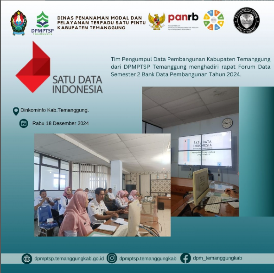 Berita Kategori: Smart Economy (Ekonomi Cerdas) Sekretariat Rabu, 18/12/2024 14:55 143 Rapat kegiatan Fasilitasi dan Pendampingan Pendaftaran e-katalog LKPP bagi BUM Desa Selengkapnya Kategori: Smart Government (Pemerintah Cerdas) Bidang Informasi dan Komunikasi Publik Rabu, 18/12/2024 13:56 104 Sukseskan Pembangunan Daerah, Dinkominfo Intensifkan Forum Data Selengkapnya Kategori: Lainnya Sekretariat Rabu, 18/12/2024 13:34 41 Desk Evaluasi dan Verifikasi Capaian Kinerja Pembangunan Daerah Selengkapnya Kategori: Smart Government (Pemerintah Cerdas) Sekretariat Rabu, 18/12/2024 13:30 53 Satgas Saber Pungli Temanggung Bahas Mitigasi Potensi Pungutan Liar Jelang Nataru 2024-2025 Selengkapnya Kategori: Lainnya Sekretariat Rabu, 18/12/2024 13:18 48 capaian penghargaan DPMPTSP di tahun 2024 Selengkapnya Kategori: Lainnya Sekretariat Rabu, 18/12/2024 13:14 38 capaian DPMPTSP di tahun 2024 Selengkapnya Kategori: Lainnya Sekretariat Rabu, 18/12/2024 13:13 39 Forum Data Pembangunan Tahun 2024 Selengkapnya Kategori: Pengumuman Sekretariat Rabu, 18/12/2024 13:11 97 Waspada Cuaca Ekstrim Selengkapnya Kategori: Smart Government (Pemerintah Cerdas) Sekretariat Rabu, 18/12/2024 13:00 191 Monev Kawasan Tanpa Rokok dan Upaya Berhenti Merokok di Kabupaten Temanggung Selengkapnya Kategori: Smart Government (Pemerintah Cerdas) Sekretariat Rabu, 18/12/2024 11:53 186 Dinas Sosial Kabupaten Temanggung menerima kunjungan studi tiru dari Bagian Perekonomian dan SDA Setda Kabupaten Klaten Selengkapnya Kategori: Smart Government (Pemerintah Cerdas) Sekretariat Rabu, 18/12/2024 10:33 143 "Hakordia 2024: Meneguhkan Komitmen, Memberantas Korupsi untuk Indonesia Maju" Selengkapnya Kategori: Smart Government (Pemerintah Cerdas) Sekretariat Rabu, 18/12/2024 10:31 53 Panduan Pembuatan NIB Selengkapnya FirstPrev10971098109911001101NextLast