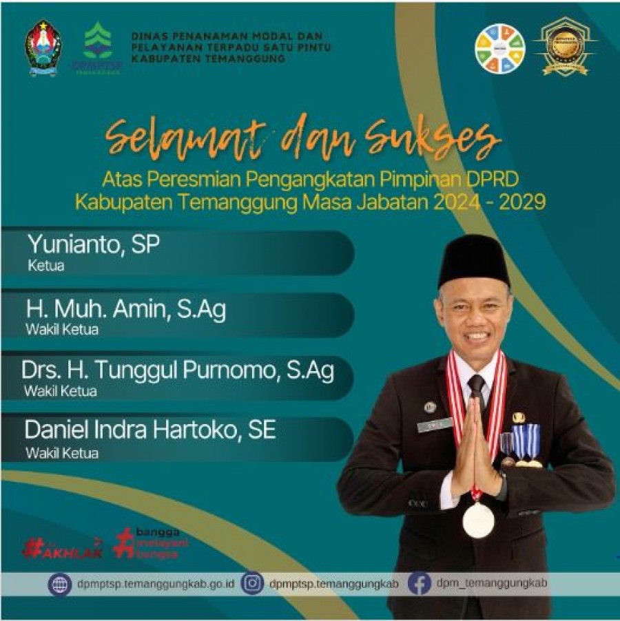 Berita Kategori: Smart Government (Pemerintah Cerdas) Sekretariat Kamis, 17/10/2024 15:17 101 Kepala DPRKPLH Kabupaten Temanggung Memimpin Serah Terima Bantuan Sepeda Motor Roda Tiga dari KLHKRI Selengkapnya Kategori: Smart Government (Pemerintah Cerdas) Bidang Informasi dan Komunikasi Publik Kamis, 17/10/2024 15:15 100 Dinkominfo Dukung Validitas Data Pembangunan Daerah Selengkapnya Kategori: Smart Government (Pemerintah Cerdas) Sekretariat Kamis, 17/10/2024 14:37 81 Kegiatan DPMPTSP 17 Oktober 2024 Selengkapnya Kategori: Smart Government (Pemerintah Cerdas) Sekretariat Kamis, 17/10/2024 14:36 76 Kegiatan DPMPTSP 17 Oktober 2024 Selengkapnya Kategori: Smart Government (Pemerintah Cerdas) Sekretariat Kamis, 17/10/2024 13:04 82 Penyampaian dan kesepakatan bobot pada perspektif Akin Pelayanan Publik Dindukcapil Selengkapnya Kategori: Smart Government (Pemerintah Cerdas) Sekretariat Kamis, 17/10/2024 10:03 111 Permintaan Dokumen Audit Kinerja Investasi pada DPMPTSP Selengkapnya Kategori: Pengumuman Sekretaris DPRD Kamis, 17/10/2024 10:00 435 Pimpinan Definitif DPRD Kabupaten Temanggung Resmi Dilantik Selengkapnya Kategori: Smart Government (Pemerintah Cerdas) Sekretariat Kamis, 17/10/2024 09:48 58 penelusuran batas desa antara Desa Legoksari, Kecamatan Tlogomulyo, dan Desa Banaran, Kecamatan Tembarak Selengkapnya Kategori: Smart Environtment (Lingkungan Cerdas) Sekretariat Kamis, 17/10/2024 09:42 138 Bimbingan Teknis Manajemen Pengelolaan Kawasan Perdesaan Provinsi Jawa Tengah Selengkapnya Kategori: Lainnya Sekretariat Kamis, 17/10/2024 09:38 125 Selamat dan Sukses atas Peresmian Pengangkatan Pimpinan DPRD Kabupaten Temanggung Masa Jabatan 2024-2029 Selengkapnya Kategori: Smart Society (Masyarakat Cerdas) Sekretariat Kamis, 17/10/2024 09:18 90 Penyuluhan dan Bimbingan Teknis bagi Badan Permusyawaratan Desa (BPD) tentang Administrasi, Fungsi dan Tugas BPD Se-Kecamatan Kranggan Selengkapnya Kategori: Smart Environtment (Lingkungan Cerdas) Sekretariat Kamis, 17/10/2024 09:00 147 Sejumlah 100 kader TPK (Tim Pendamping Keluarga) dari 20 kecamatan se Kabupaten Temanggung, pada hari Kamis tanggal 17 Oktober 2024 Mengikuti Re Orientasi TPK Selengkapnya FirstPrev11881189119011911192NextLast