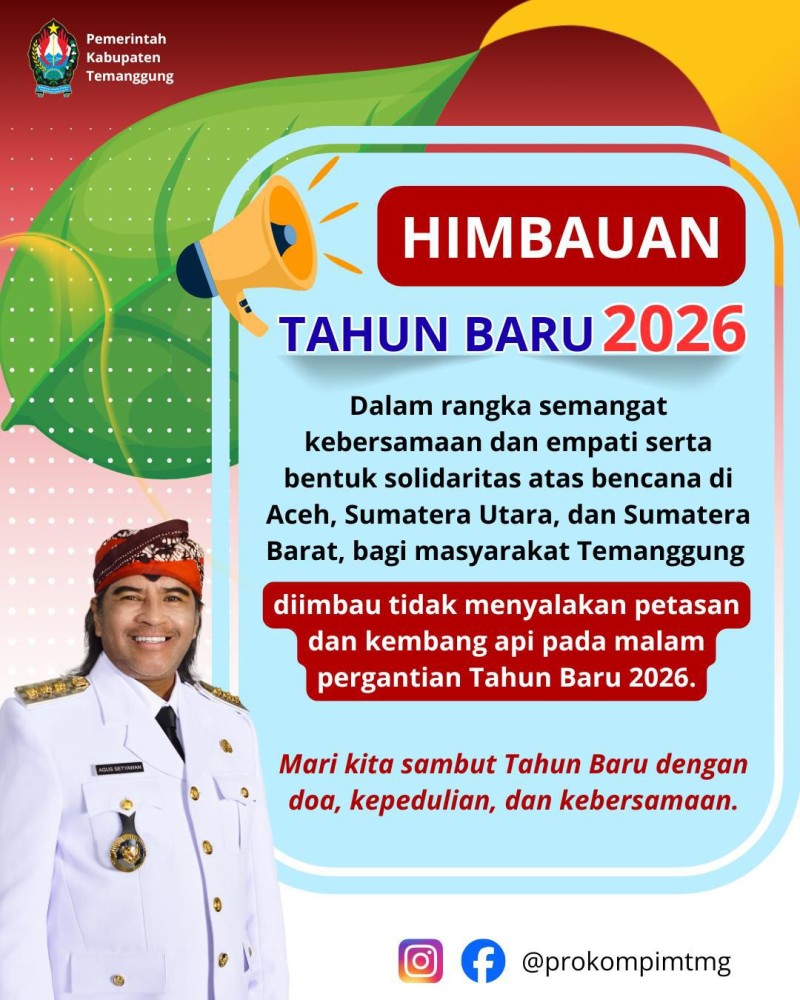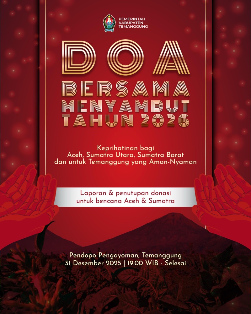 Kategori Smart Government (Pemerintah Cerdas) Kategori: Smart Government (Pemerintah Cerdas) Sekretariat 31 Desember 2025 09:24:00 7 Pos Pam Tugu Jam Temanggung Pastikan Keamanan dan Kelancaran Arus Lalu Lintas Nataru Selengkapnya Kategori: Smart Government (Pemerintah Cerdas) Sekretariat 31 Desember 2025 09:19:00 23 Bersama Kita Pilah Sampah Selengkapnya Kategori: Smart Government (Pemerintah Cerdas) Sekretariat 31 Desember 2025 09:00:00 4 PENGUMUMAN Selengkapnya Kategori: Smart Government (Pemerintah Cerdas) Sekretariat 31 Desember 2025 09:00:00 2 LAST DAY OF 2025 Selengkapnya Kategori: Smart Government (Pemerintah Cerdas) Sekretariat 31 Desember 2025 08:45:00 5 Doa Bersama Menyambut Tahun 2026 Selengkapnya Kategori: Smart Government (Pemerintah Cerdas) Sekretariat 31 Desember 2025 08:27:00 8 Pos Pam RSK Parakan Laksanakan Apel Pagi dan Pemantauan Lalu Lintas pada Pengamanan Nataru Selengkapnya Kategori: Smart Government (Pemerintah Cerdas) Sekretariat 31 Desember 2025 08:00:00 19 Liburan Minim Sampah Selengkapnya Kategori: Smart Government (Pemerintah Cerdas) Instalasi 31 Desember 2025 07:43:00 13 Apel Pagi di Penghujung Tahun 2025 Selengkapnya Kategori: Smart Government (Pemerintah Cerdas) Sekretariat 30 Desember 2025 23:10:00 0 Pemkab Temanggung Imbau Warga Tidak Nyalakan Petasan pada Malam Tahun Baru 2026 Selengkapnya Kategori: Smart Government (Pemerintah Cerdas) Sekretariat 30 Desember 2025 22:53:00 8 Situasi Aman dan Terkendali, Pos Pam RSK Parakan Laksanakan Pengamanan Nataru Selengkapnya Kategori: Smart Government (Pemerintah Cerdas) Sekretariat 30 Desember 2025 22:52:00 9 Giat Pengamanan Natal 2025 dan Tahun Baru 2026 di Pos Pam Tugu Jam Temanggung Selengkapnya Kategori: Smart Government (Pemerintah Cerdas) Seksi Penanganan Darurat dan Logistik 30 Desember 2025 22:50:00 12 Pos Pam Nataru Parakan Tangani Kecelakaan Lalu Lintas di Bangjo Sari Ayam Selengkapnya FirstPrev7891011NextLast