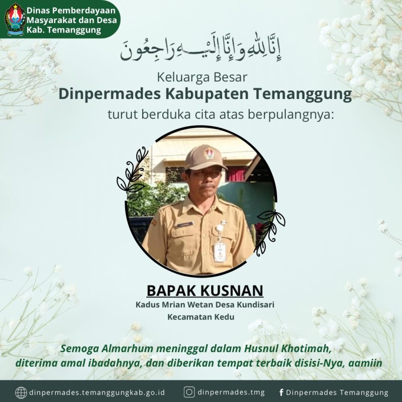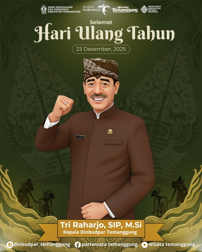 Kategori Lainnya Kategori: Lainnya Sekretariat 24 Desember 2025 15:15:00 9 Peletakan Batu Pertama Pembangunan Mushola DPRKPLH Kabupaten Temanggung Selengkapnya Kategori: Lainnya Sekretariat 23 Desember 2025 14:41:00 2 Turut berduka cita yang mendalam atas wafatnya almarhum Bapak Kusnan (Kadus Mrian Wetan Desa Kundisari). Selengkapnya Kategori: Lainnya Sekretariat 23 Desember 2025 13:20:00 6 Kepala Badan Kesatuan Bangsa dan Politik (Bankesbangpol) Kabupaten Temanggung, Bapak Djoko Prasetyono, S.Sos., M.M., menghadiri kegiatan yang diselenggarakan oleh Partai Kebangkitan Bangsa (PKB) Kabupaten Temanggung. Selengkapnya Kategori: Lainnya Sekretariat 23 Desember 2025 11:30:00 11 HUT KADINPAR KE-55 Selengkapnya Kategori: Lainnya Sekretariat 22 Desember 2025 12:02:00 4 Badan Kesatuan Bangsa dan Politik (BANKESBANGPOL) melaksanakan Apel Luar Biasa Selengkapnya Kategori: Lainnya Sekretariat 22 Desember 2025 10:30:00 4 Selamat Memperingati Hari Ibu ke-97 Selengkapnya Kategori: Lainnya Sekretariat 19 Desember 2025 10:54:00 13 BANKESBANGPOL melaksanakan kegiatan Gladi Bersih Apel Luar Biasa Hari Ibu Selengkapnya Kategori: Lainnya UPT 18 Desember 2025 10:51:00 13 Verifikasi Internal Alat Standar UPTD Metrologi Legal Selengkapnya Kategori: Lainnya Bidang Pariwisata 16 Desember 2025 08:18:00 28 DINBUDPAR TEMANGGUNG MENGIKUTI RAKOR SINERGITAS TAHUN 2026 BIDANG KEPEMUDAAN, KEOLAHRAGAAN DAN PARIWISATA PROVINSI JAWA TENGAH DI SOLO Selengkapnya Kategori: Lainnya Sekretariat 15 Desember 2025 11:15:00 29 penandatanganan rapor hasil Praktik Kerja Lapangan (PKL) siswa SMK Swadaya Kabupaten Temanggung. Selengkapnya Kategori: Lainnya UPT 12 Desember 2025 08:40:00 28 Pengawasan Pompa Ukur BBM di SPBU 44.562.17 Soropadan, Kecamatan Pringsurat Selengkapnya Kategori: Lainnya UPT 11 Desember 2025 09:10:00 25 Tera Ulang UTTP di PT Selo Kencono Putra Persada, Badran, Kranggan Selengkapnya 123NextLast