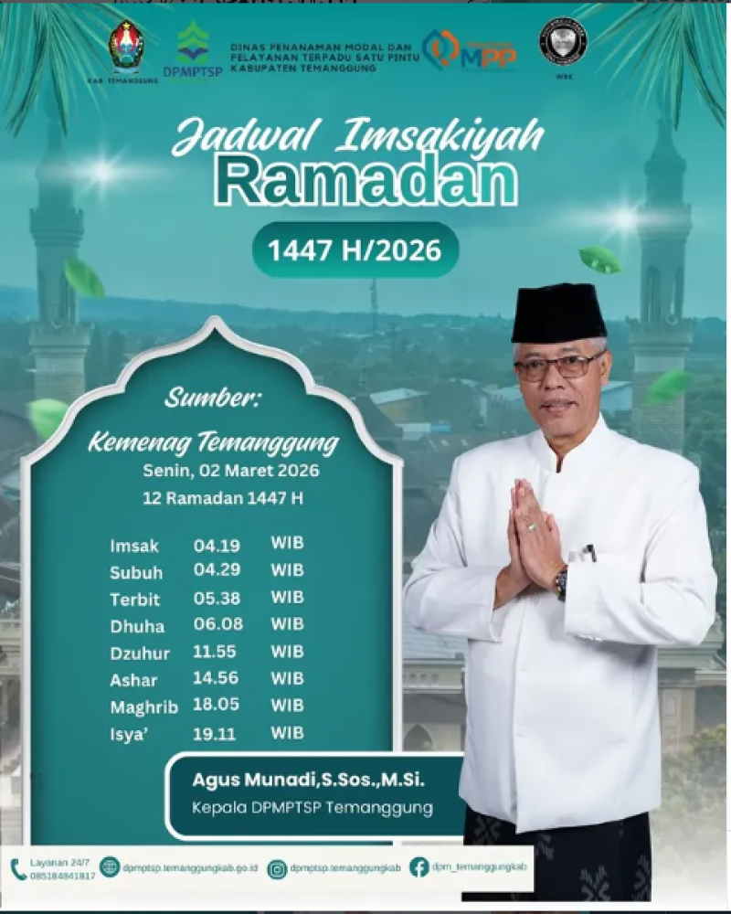Kategori Lainnya Kategori: Lainnya Sekretariat 25 Maret 2026 10:39:00 0 Badan Kesatuan Bangsa dan Politik (Bankesbangpol) Kabupaten Temanggung melaksanakan kegiatan Halal Bihalal Selengkapnya Kategori: Lainnya Sekretariat 25 Maret 2026 10:38:00 0 Badan Kesatuan Bangsa dan Politik (Bankesbangpol) Kabupaten Temanggung melaksanakan kegiatan apel pagi Selengkapnya Kategori: Lainnya Sekretariat 21 Maret 2026 10:47:00 0 Selamat Hari Raya Idul Fitri 1447 H Selengkapnya Kategori: Lainnya Sekretariat 21 Maret 2026 09:30:00 0 Selamat Hari Raya Idul Fitri 1 Syawal 1447 Hijriah / 2026 Masehi Selengkapnya Kategori: Lainnya Sekretariat 20 Maret 2026 10:59:00 0 Selamat Hari Raya Idul Fitri 1447 H Selengkapnya Kategori: Lainnya Sekretariat 19 Maret 2026 10:44:00 1 Selamat Hari Raya Nyepi Selengkapnya Kategori: Lainnya Sekretariat 19 Maret 2026 09:26:00 0 Selamat Hari Raya Nyepi Tahun Baru Saka 1948 / 2026 Masehi Selengkapnya Kategori: Lainnya Sekretariat 16 Maret 2026 09:02:00 0 Turut berduka cita atas berpulangnya: Muhammad Nurul Huda Sekdes Salamrejo Kecamatan Selopampang Selengkapnya Kategori: Lainnya Sekretariat 10 Maret 2026 11:02:00 3 Bimbingan Teknis Manajemen Risiko Indeks Selengkapnya Kategori: Lainnya Sekretariat 10 Maret 2026 10:26:00 0 Badan Kesatuan Bangsa dan Politik (Bankesbangpol) Kabupaten Temanggung melaksanakan kegiatan pembinaan kepada tenaga keamanan Selengkapnya Kategori: Lainnya Sekretariat 03 Maret 2026 10:25:00 1 Seluruh Keluarga besar DPMPTSP Kabupaten Temanggung Turut berduka cita sedalam-dalamnya Selengkapnya Kategori: Lainnya Sekretariat 02 Maret 2026 10:22:00 1 Jadwal Imsakiyah Selengkapnya 123NextLast