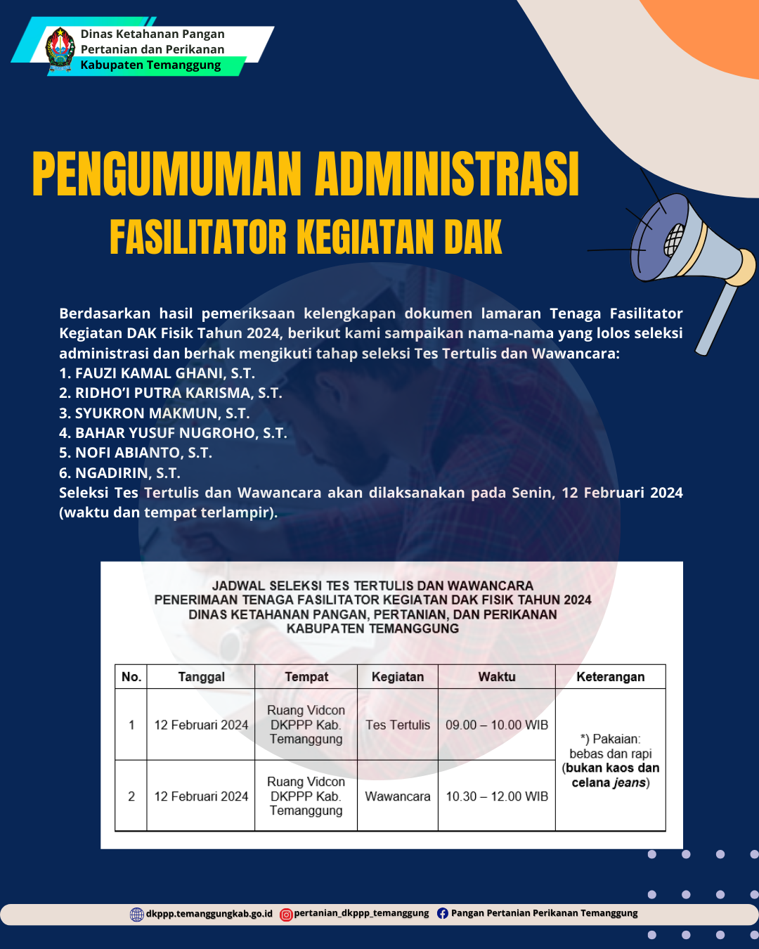 Kategori Pengumuman Kategori: Pengumuman Sekretariat 28 Maret 2024 14:10:00 232 MEMPERINGATI WAFATNYA YESUS KRISTUS Selengkapnya Kategori: Pengumuman Sekretariat 22 Maret 2024 09:35:00 808 Mulai Januari 2024, Pelayanan Uji Kir Kendaraan Bermotor di Temanggung Gratis Selengkapnya Kategori: Pengumuman Sekretariat 18 Maret 2024 08:00:00 58 Sedekah Kopi dan Lembutan ke 4 Selengkapnya Kategori: Pengumuman Sekretariat 11 Maret 2024 08:41:00 291 Selamat Menunaikan Ibadah Puasa Ramadhan 1445 H Selengkapnya Kategori: Pengumuman Sekretariat 10 Maret 2024 17:24:00 221 Selamat Menjalankan Ibadah Puasa Selengkapnya Kategori: Pengumuman Sekretariat 10 Maret 2024 14:18:00 228 Selamat Hari Raya Nyepi Selengkapnya Kategori: Pengumuman Sekretariat 08 Maret 2024 08:42:00 401 Hari dan Jam Kerja Dinpermades Kabupaten Temanggung Selengkapnya Kategori: Pengumuman Sekretariat 22 Februari 2024 00:00:00 434 Pasar Tani Jumpa DKPPP Selengkapnya Kategori: Pengumuman Sekretariat 20 Februari 2024 00:00:00 431 PENGUMUMAN HASIL TES TERTULIS DAN WAWANCARA PENERIMAAN TENAGA FASILITATOR KEGIATAN DAK FISIK TAHUN 2024 DINAS KETAHANAN PANGAN, PERTANIAN, DAN PERIKANAN KABUPATEN TEMANGGUNG Nomor : 520 / 231 / 2024 Selengkapnya Kategori: Pengumuman Sekretariat 16 Februari 2024 00:00:00 466 PENGUMUMAN HASIL TES TERTULIS DAN WAWANCARA SELEKSI PENERIMAAN TENAGA FASILITATOR KEGIATAN DAK FISIK TAHUN 2024 DINAS KETAHANAN PANGAN, PERTANIAN, DAN PERIKANAN KABUPATEN TEMANGGUNG Nomor : 520 / 224 / 2024 Selengkapnya Kategori: Pengumuman Sekretariat 07 Februari 2024 00:00:00 468 PENGUMUMAN HASIL SELEKSI ADMINISTRASI PENERIMAAN TENAGA FASILITATOR KEGIATAN DAK FISIK TAHUN 2024 DINAS KETAHANAN PANGAN, PERTANIAN, DAN PERIKANAN KABUPATEN TEMANGGUNG Nomor : 521 / 215 / 2024 Selengkapnya Kategori: Pengumuman Sekretariat 03 Februari 2024 00:00:00 1390 Lowongan Pekerjaan untuk Tenaga Fasilitator Pembangunan Smart Green House Selengkapnya FirstPrev2425262728NextLast