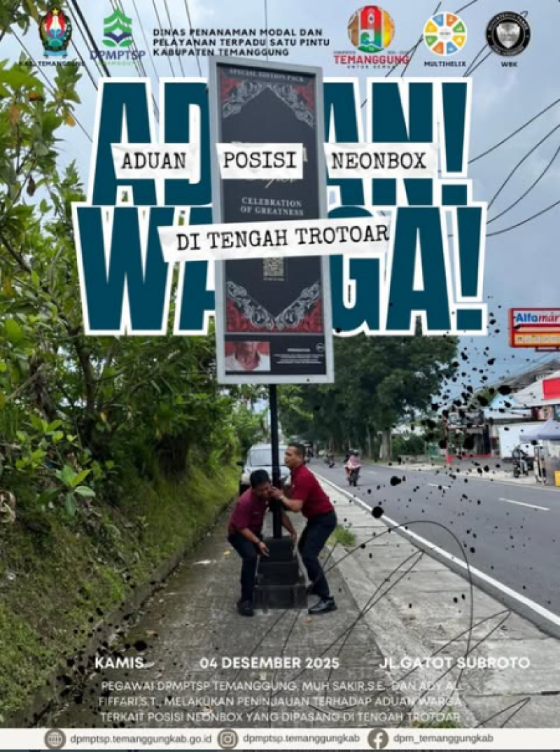 Kategori Lainnya Kategori: Smart Government (Pemerintah Cerdas) , Lainnya 04 Desember 2025 17:57:00 15 Membangun Harmoni Birokrasi: Apel Luar Biasa bersama Pj. Sekda Temanggung Selengkapnya Kategori: Lainnya , Lainnya 04 Desember 2025 17:21:00 44 Solar Tumpah di Jalan Raya Bulu–Parakan, Damkar Temanggung Lakukan Evakuasi dan Pengamanan Lokasi Selengkapnya Kategori: Lainnya , Lainnya 04 Desember 2025 16:18:00 49 Damkar Temanggung Berhasil Evakuasi Pemotongan Cincin Titanium di Pos WMK Candiroto Selengkapnya Kategori: Lainnya , Lainnya 04 Desember 2025 10:16:00 72 Satpol PP Temanggung Tertibkan Penataan Kursi Kafe di Area Tugu Jam Selengkapnya Kategori: Lainnya , Lainnya 04 Desember 2025 10:11:00 41 Satpol PP Temanggung Tertibkan Baliho dan Spanduk Melanggar Ketentuan K4 di Tiga Kecamatan Selengkapnya Kategori: Smart Government (Pemerintah Cerdas) , Lainnya 04 Desember 2025 10:00:00 2 Menindak Lanjuti Aduan Reklame Selengkapnya Kategori: Smart Government (Pemerintah Cerdas) , Lainnya 04 Desember 2025 10:00:00 21 Membangun Harmoni Birokrasi: Apel Luar Biasa bersama Pj. Sekda Temanggung Selengkapnya Kategori: Lainnya , Lainnya 04 Desember 2025 09:58:00 2 Penyusunan RTKD Selengkapnya Kategori: Lainnya , Lainnya 04 Desember 2025 09:14:00 70 Satpol PP Temanggung Tertibkan PKL di Jalan Ahmad Yani, Pedagang Bersikap Kooperatif Selengkapnya Kategori: Lainnya , Lainnya 04 Desember 2025 09:00:00 31 UPTD Metrologi Legal Kabupaten Temanggung melaksanakan pengawasan pompa ukur BBM menjelang Hari Besar Keagamaan Nasional (HBKN) Menjelang Natal dan Tahun Baru 2025 Selengkapnya Kategori: Smart Government (Pemerintah Cerdas) , Lainnya 04 Desember 2025 08:53:00 48 DINAS SOSIAL BERSAMA DPC PPDI MENYELENGGARAKAN HDI TAHUN 2025 Selengkapnya Kategori: Smart Government (Pemerintah Cerdas) , Lainnya 04 Desember 2025 08:40:00 49 Apel pagi Dinas Sosial Hari Kamis tanggal 4 Desember2025 Selengkapnya FirstPrev2223242526NextLast