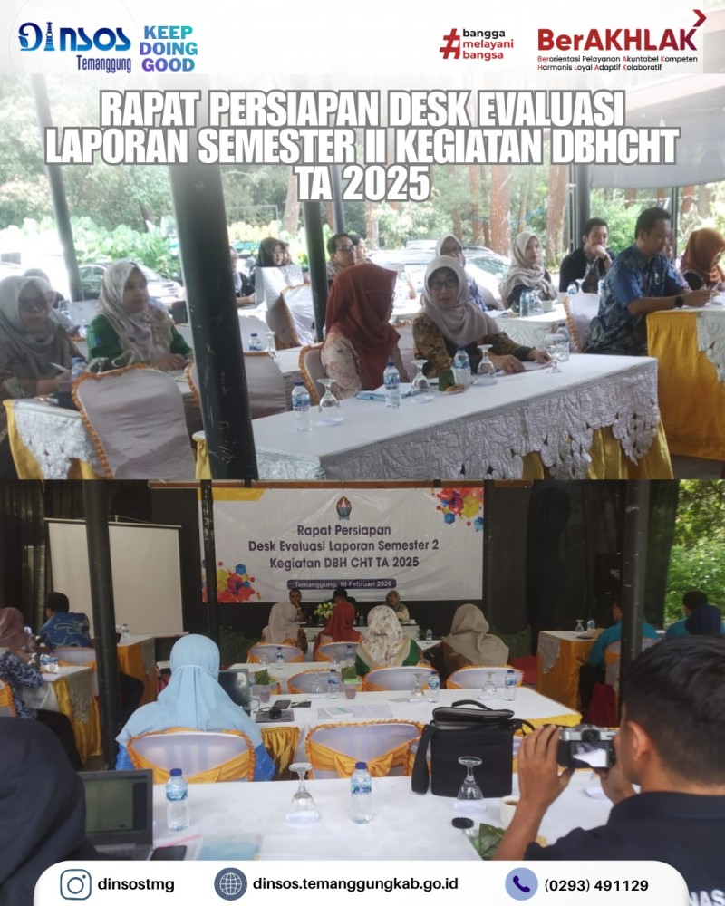 Kategori DBHCHT (Cukai Tembakau) Kategori: Smart Government (Pemerintah Cerdas) , DBHCHT (Cukai Tembakau) 10 Februari 2026 14:31:00 3 Dinas Sosial menghadiri rapat persiapan desk evaluasi laporan semester 2 kegiatan DBHCHT Tahun Anggaran 2025 Selengkapnya Kategori: Smart Government (Pemerintah Cerdas) , DBHCHT (Cukai Tembakau) 10 Februari 2026 14:13:00 10 Rapat persiapan desk evaluasi laporan semester 2 kegiatan DBHCHT tahun anggaran 2025 Selengkapnya Kategori: Smart Economy (Ekonomi Cerdas) , DBHCHT (Cukai Tembakau) 15 Januari 2026 13:00:00 0 LTT Padi Desa Muncar Selengkapnya Kategori: Lainnya , DBHCHT (Cukai Tembakau) 11 Desember 2025 10:18:00 8 Desk RKP DBHCHT Selengkapnya Kategori: Smart Living (Hidup Cerdas) , DBHCHT (Cukai Tembakau) 10 Desember 2025 08:58:00 53 Pertemuan Lintas Sektor Kesehatan dan Penyerahan Penghargaan Posyandu Terinovatif Selengkapnya Kategori: Smart Economy (Ekonomi Cerdas) , DBHCHT (Cukai Tembakau) 17 November 2025 12:22:00 54 Sosialisasi Draft Raperbup Kawasan Tanpa Rokok (KTR) sebagai juknis pelaksanaan Perda KTR. Selengkapnya Kategori: Smart Economy (Ekonomi Cerdas) , DBHCHT (Cukai Tembakau) 03 November 2025 14:37:00 61 Pertemuan Sinkronisasi Hasil Riset Tembakau dan Rencana Pembangunan Aglomerasi Pabrik Hasil Tembakau (APHT) Selengkapnya Kategori: Smart Government (Pemerintah Cerdas) , DBHCHT (Cukai Tembakau) 20 Oktober 2025 09:16:00 70 Rapat Teknis Penyusunan Master Plan Aglomerasi Pabrik Hasil Tembakau (APHT) Selengkapnya Kategori: Smart Economy (Ekonomi Cerdas) , DBHCHT (Cukai Tembakau) 15 Oktober 2025 10:51:00 102 Rapat Koordinasi Penyusunan Master Plan SIHT menuju APHT Selengkapnya Kategori: Lainnya , DBHCHT (Cukai Tembakau) 02 Oktober 2025 12:44:00 112 Kasatpol PP dan Damkar Temanggung Hadiri Rakor Penegakan Perda dan Evaluasi Pemberantasan BKC Ilegal 2025 di Bandungan Selengkapnya Kategori: Smart Economy (Ekonomi Cerdas) , DBHCHT (Cukai Tembakau) 11 September 2025 11:46:00 114 Rapat Koordinasi Rencana Kegiatan 2026 Selengkapnya Kategori: Lainnya , DBHCHT (Cukai Tembakau) 20 Agustus 2025 07:10:00 175 Kegiatan jalan sehat dalam rangka memeriahkan Hari Ulang Tahun Kemerdekaan Republik Indonesia Ke-80 di Pasar Kliwon Temanggung Selengkapnya 123NextLast