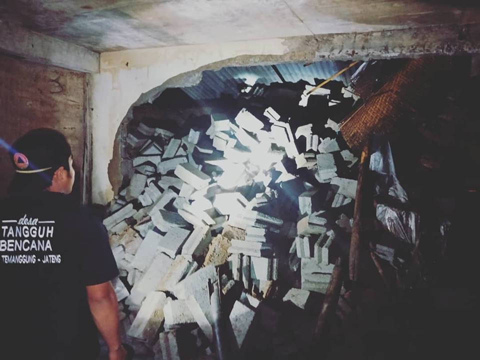 BANSARI - Hujan Deras Dusun Tambahsari Desa Bansari Kec. Bansari mengakibatkan massa tanah bertambah berat pada tebing yang berada di samping dinding rumah , Di atas tebing juga di gunakan sebagai tempat menumpuk material batako,sehingga mengakibatkan longsor. Akibat kejadian ini tembok berukuran Lebar 6 meter dan Tinggi 3 Meter longsor.Material longsor menimpa dapur, tidak ada korban dalam kejadian ini,(08/04/19)