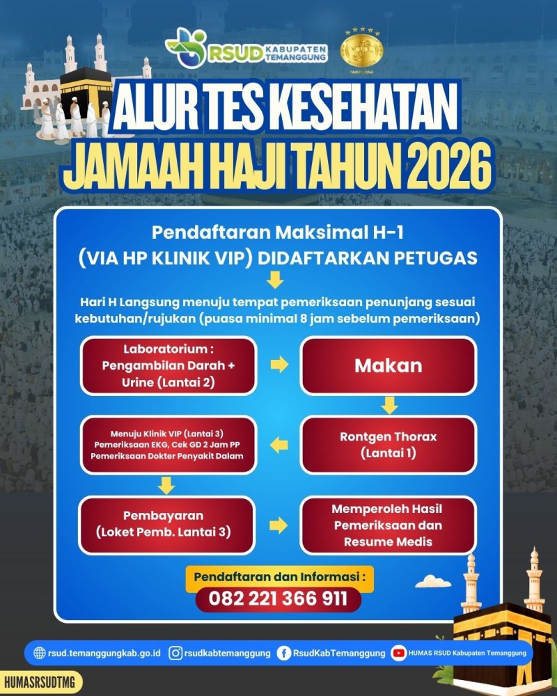 RSUD Kabupaten Temanggung menyediakan Paket Medical Check Up (MCU) khusus bagi calon jamaah haji untuk memastikan tubuh siap menjalani ibadah di Tanah Suci.