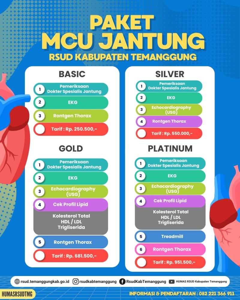 RSUD Kabupaten Temanggung menyediakan Paket MCU Jantung mulai dari Basic, Silver, Gold hingga Platinum, dengan pemeriksaan lengkap oleh dokter spesialis jantung dan penunjang modern.