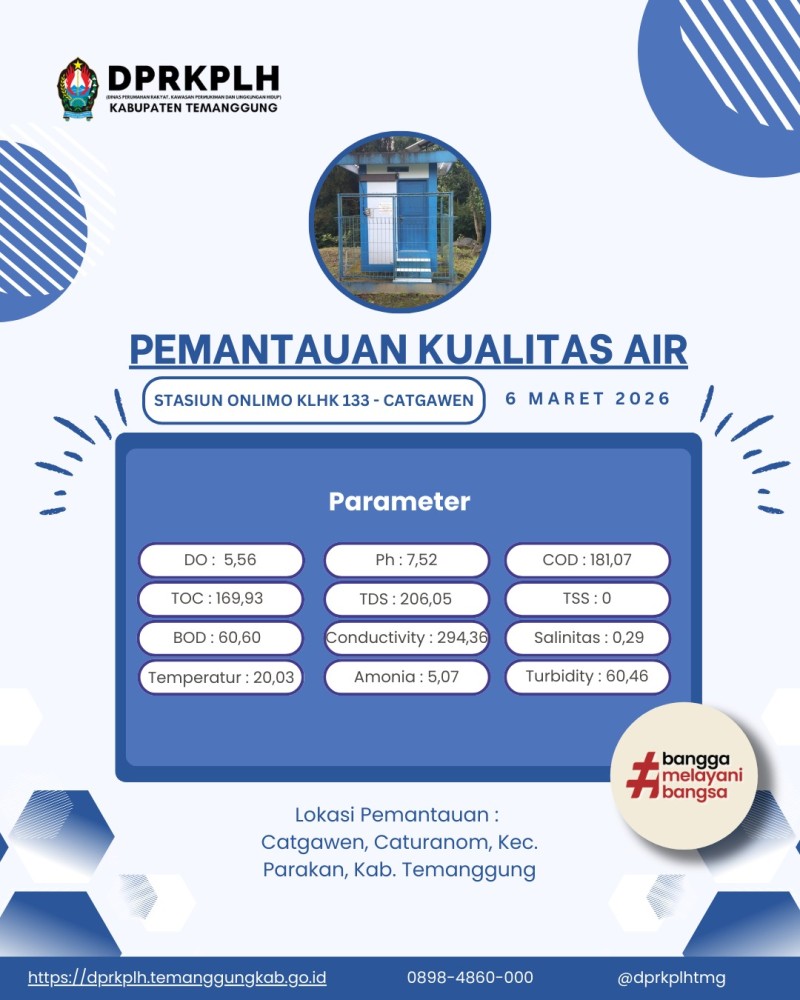 Pada hari Senin, 9 Maret 2026, kami menyampaikan tabel hasil pemantauan parameter kualitas air yang telah dilaksanakan di Pos Stasiun ONLIMO 133 – Catgawen pada hari Kamis, 5 Maret 2026 hingga Minggu, 8 Maret 2026. Data pada tabel tersebut merupakan hasil pengukuran beberapa parameter utama sebagai indikator kondisi perairan sungai yang dipantau secara real time dan berkelanjutan.