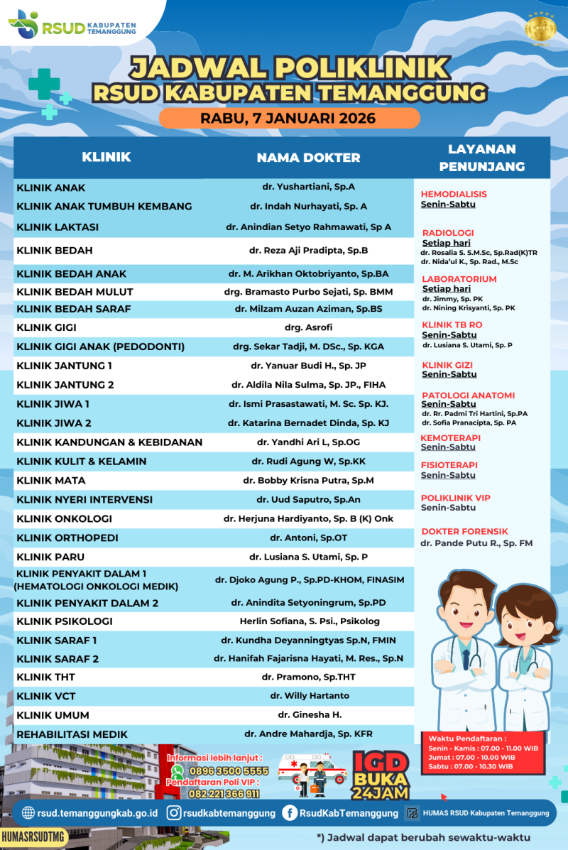 Pelayanan Kategori: BPS Minggu, 07/09/2025 10:49 448 Pelayana Statistik Terpadu Selengkapnya Kategori: DINPERINAKER Minggu, 07/09/2025 10:02 430 Layanan Dinas Perindustrian dan Tenaga Kerja Selengkapnya Kategori: IMIGRASI Minggu, 07/09/2025 10:01 525 Layanan Imigrasi Selengkapnya Kategori: DKPPP Minggu, 07/09/2025 10:00 398 Layanan DKPPP Selengkapnya Kategori: DPUPR Minggu, 07/09/2025 10:04 509 Layanan PBG dab SLF Selengkapnya Kategori: BPKPAD Minggu, 07/09/2025 09:27 448 Pelyanan Pajak Reklame Selengkapnya Kategori: DINKOPDAG Minggu, 07/09/2025 08:47 425 Alur Proses Penerbitan Rekomendasi BBM Selengkapnya Kategori: DISHUB Rabu, 03/09/2025 14:16 264 Pembuatan SK Izin Trayek Angkutan 5 Tahunan Selengkapnya Kategori: DPMPTSP Minggu, 07/09/2025 09:35 300 Syarat Layanan Izin Berusaha dan Non Berusaha Selengkapnya Kategori: Dokter RSUD Kabupaten Temanggung Kamis, 28/08/2025 11:26 1111 Dokter RSUD Kabupaten Temanggung Selengkapnya Kategori: Jadwal Poliklinik Rabu, 07/01/2026 10:25 2091 Jadwal Poliklinik Harian Selengkapnya Kategori: Safety Brifing RSUD Kabupaten Temanggung Selasa, 01/07/2025 11:16 654 Safety Brifing RSUD Kabupaten Temanggung Selengkapnya Prev12345NextLast